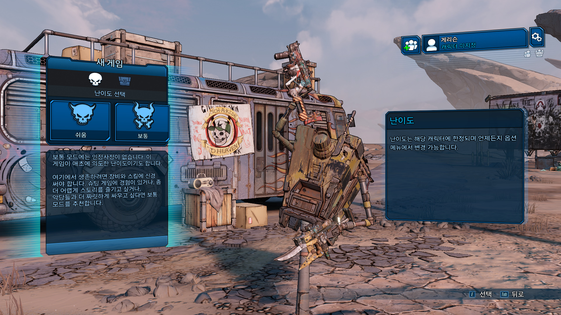 게임을 시작하려니 난이도를 선택하란다. 난이도는 쉬움과 보통이 있는데 템드랍과 관련해서 메리트가 있는걸로 보이진 않는다. 하지만 재미를 위해 조금 어려운 보통을 선택했다. 보아하니 피통의 차이인듯하다.