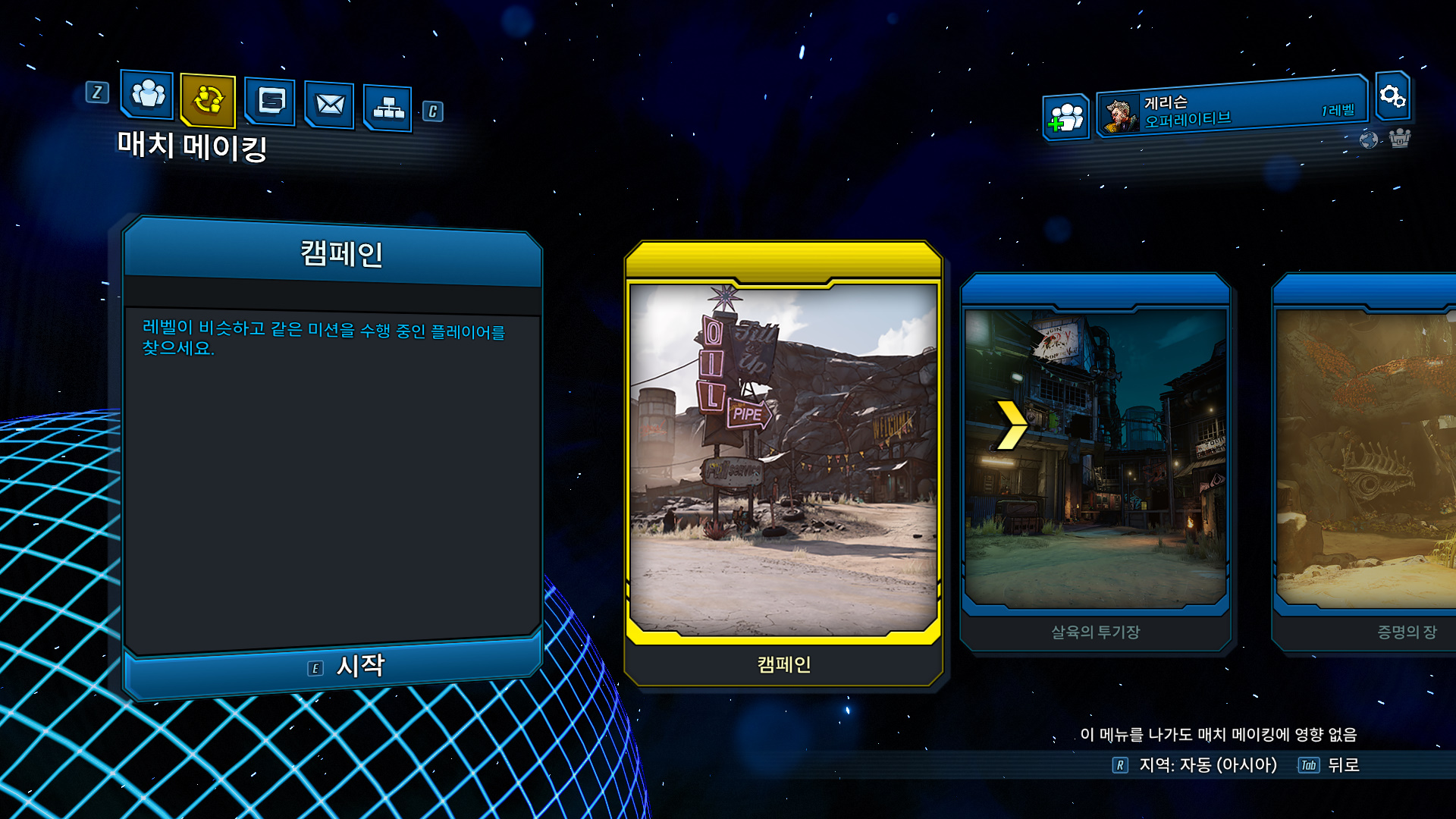 참고로 F1, F2키를 누르면 각각 매치메이킹과 쉬프트코드 등록및 쉬프트 로그인이 가능한 주메뉴로 간다. 이번 보더랜드3는 매치 메이킹 시스템이 도입되었다. 관건은 서버가 2K서버로 공유되어 스팀유저와도 할수 있느냐인것 같다.