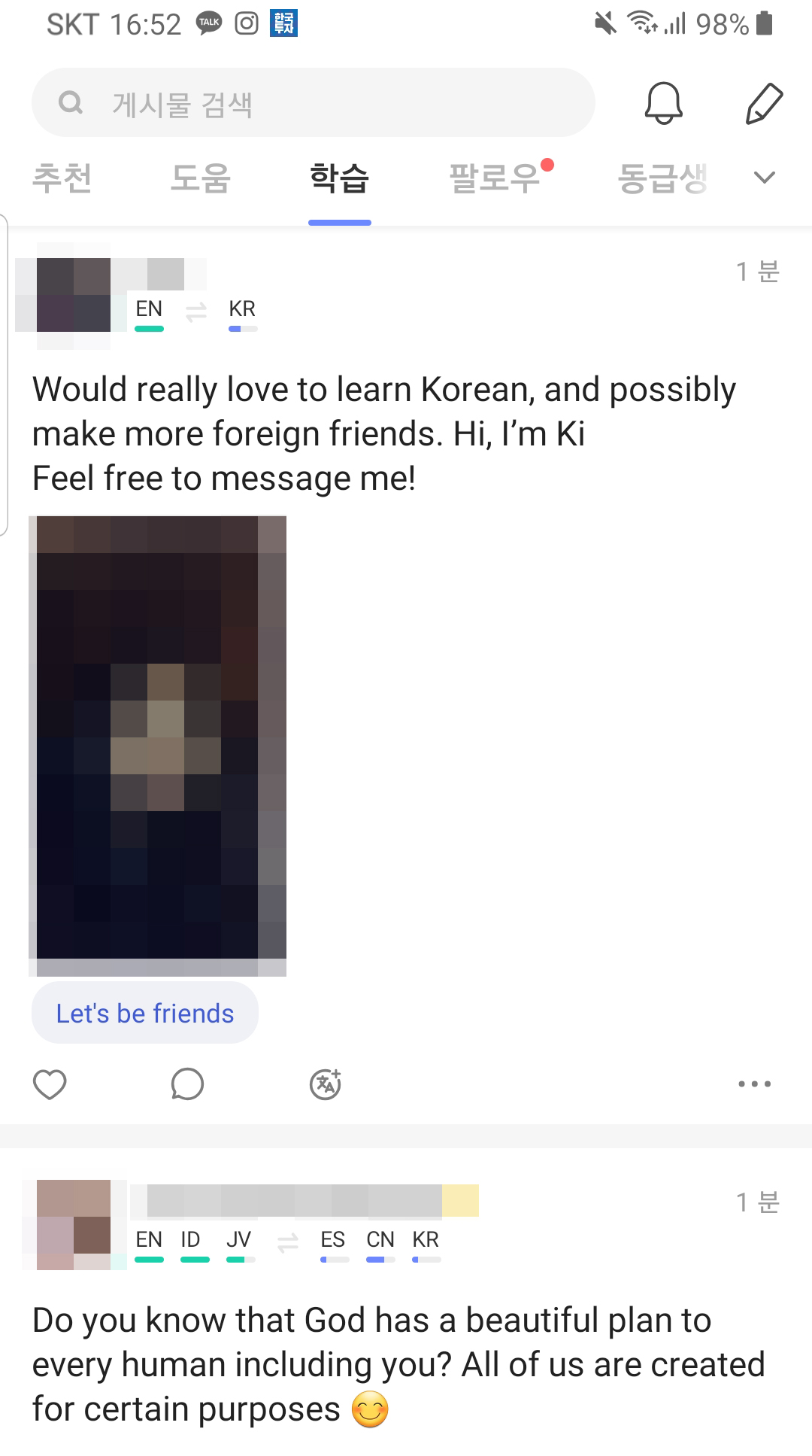 그리고 모국어와 배우고 있는 언어와 난이도를 선태하면 자신과 맞는 상대의 글들이 뜬다.