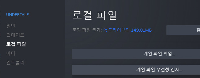 스팀 라이브러리에서 언더테일을 우클릭하고 속성을 누른 뒤, 로컬파일을 선택, 그다음 게임 파일 무결성 검사를 실시한다.