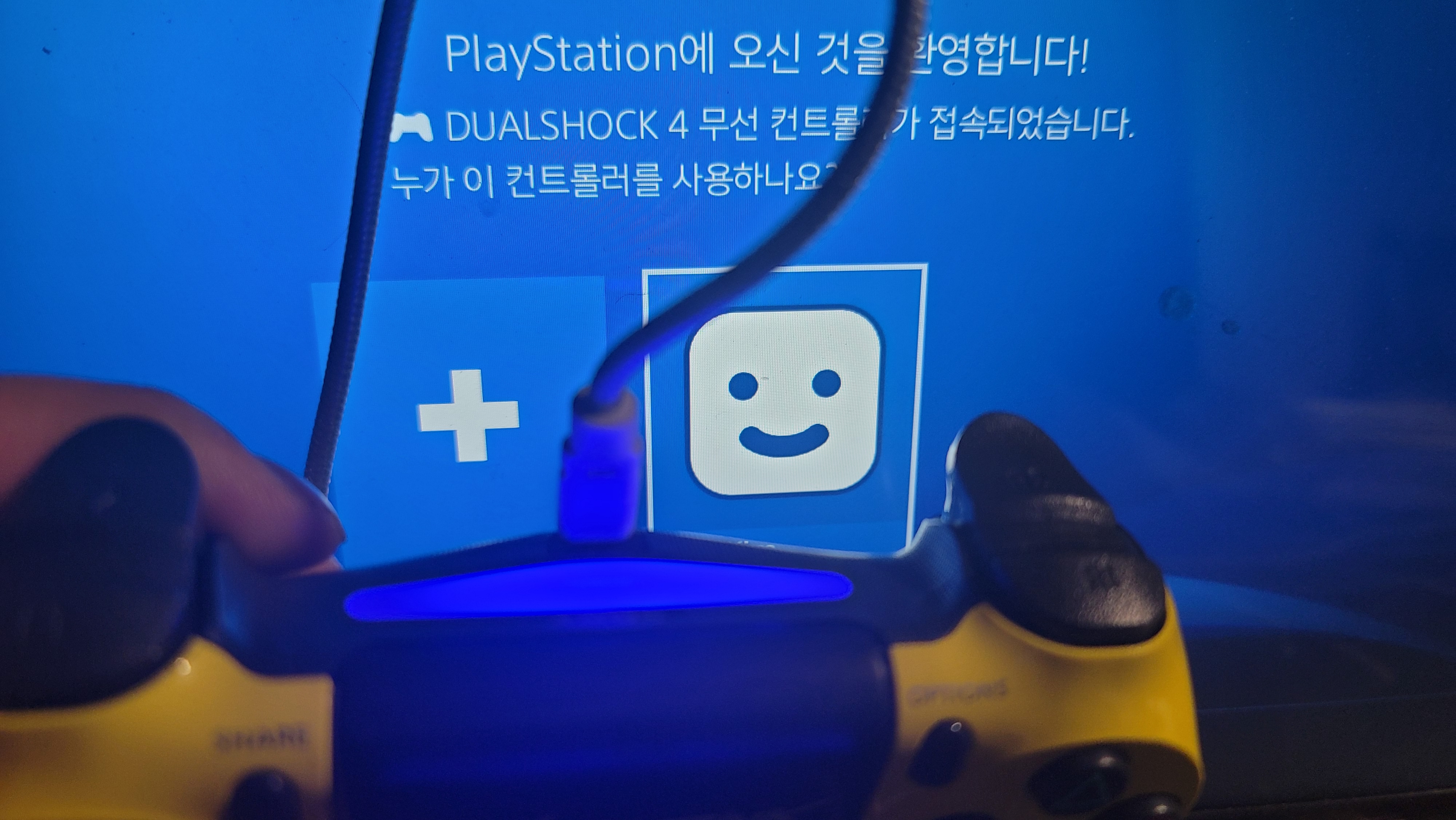 PS4와 듀얼쇼크4를 마이크로5핀 케이블로 연결한 다음 PS버튼을 누르면 연결 끝.